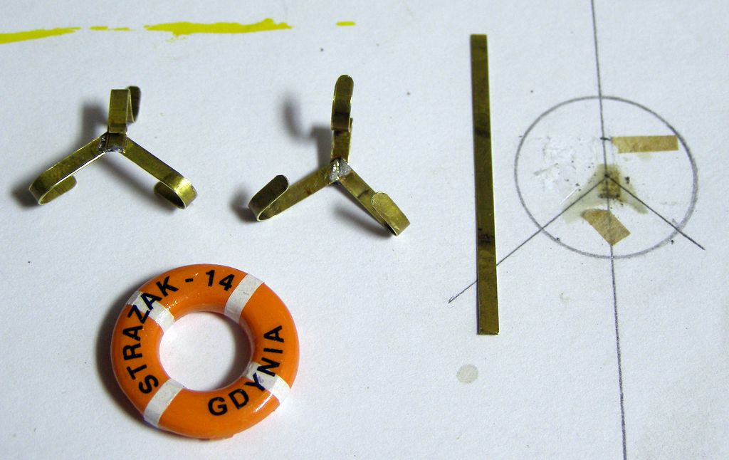 Až sem je to normál, ale proč to vlastně všechno. Jde o ten špagát co je kolem kruhu a kterého se tonoucí chytá. Na většině modelů můžete vidět vzorně natvarovaná lana, tvořící jakýsi čtverec kolem kruhu. Což je s prominutím blbost, lano není naškrobeno a nedrží onen pěkný tvar, ale volně leží na kruhu respektujíc zemskou přitažlivost. Stačí se přitom podívat na fotografie, nebo na skutečnou loď. Poslední, co ještě musíte udělat, je závěsné zařízení, do kterého se kruhy zavěsí. Mám je sletované z tenké mědi a na zábradlí přilepené prstolepem. Tolik asi písemně, vše ostatní odkoukáte z fotografií.