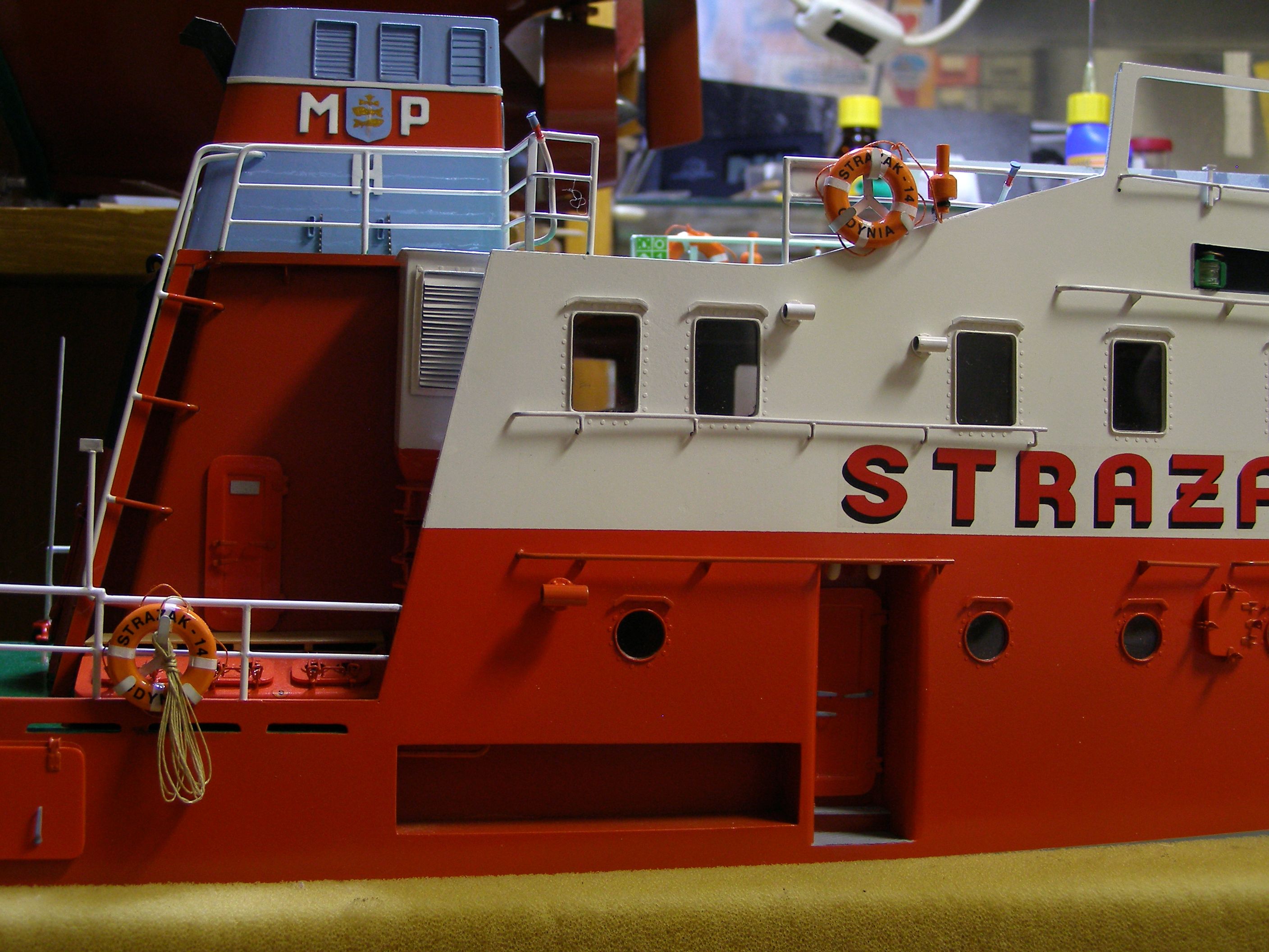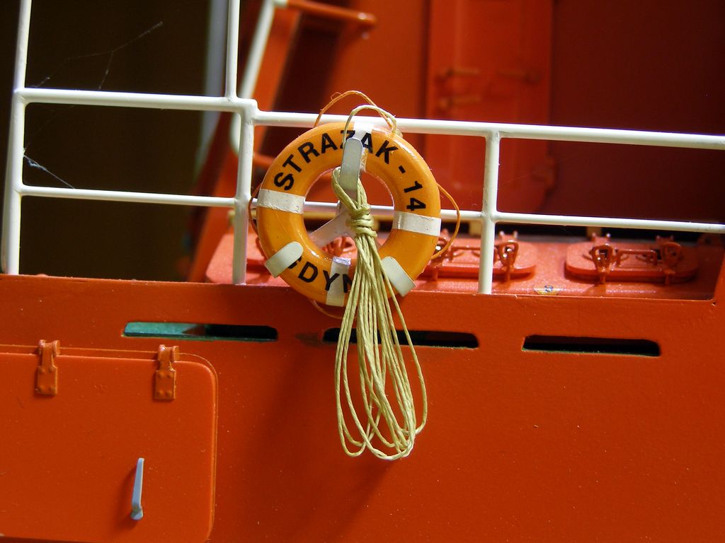 Na Stražaku 14 jsou vidět a i v plánu uvedeny 4 kusy záchranách kruhů. Takže kdysi dávno jsem udělal pěkně 4 holá kolečka podle plánu a odložil je do krabičky. Pak jsem se po dlouhé době dostal snad již opravdu do závěrečné fáze a přišla řada i na kruhy. Ke své hrůze jsem, ale zjisti, že na fotografiích, podle kterých stavím a doplňuji původní plán, jsou již kruhy nové. Žádný obandážovaný korek, ale umělohmotný výlisek. Takže jsem musel opět na začátek a vyrábět znovu.