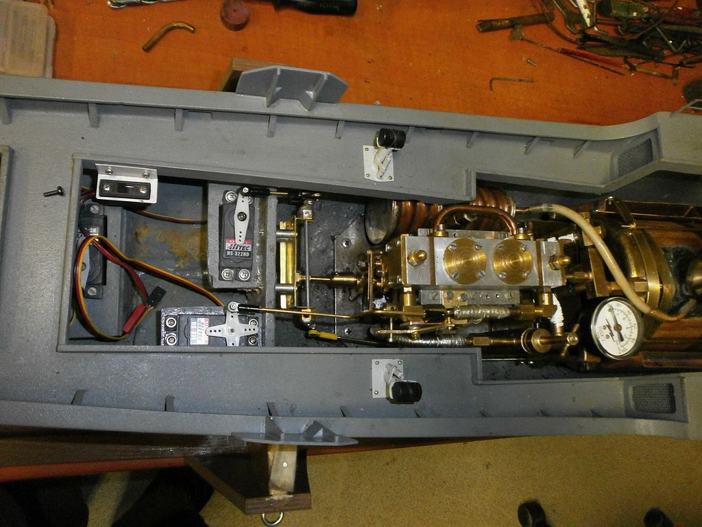 Na přidaných obrázcích jsem jen lehce naznačil, co jsem až dosud dělal - i když to snad ani nepoužiju: Nový tahač Rosegarth (hnědá lodička) - uvidíme do budoucna - plave dobře, ale momentálně mám jiné plány, kompaundní tříválec (musím změnit názvosloví z expansního na právě kompaundní) - přidal jsem prostě expansnímu dvouválci další válec a dva válce dostávají páru přímo a jejich výfuk jde do velkého válce. Popisuji to v článku, který vyjde (snad?) v dubnovém čísle RCM. Pak je tu pohled na rychloběžný strojek v Kristinině lodi Muškát - málo místa, a tak jsem musel obětovat váhu a kolem kotle jsou dvě tenké nádobky na kondenzát - viz pohled do lodi shora a poslední pohled na rekonstruovanou strojovnu se týká Bledule - lapačem kondenzátu jde trubka a v ní je unašeč šroubového hřídele - jiná možnost nebyla… Ale lodička plave taky moc pěkně.