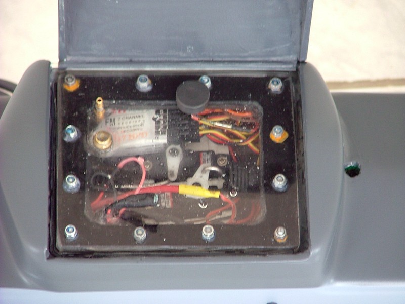 Po zalepení a dôkladnom vyliatí spojov z vnútornej časti trupu pristúpime k osadeniu raketovej šachty.. Zadná časť tejto trubky je zaslepená a utesnená lepidlom. Ako upchávku som použil kruh z HP dosky. V strede tohto kruhu je vyvŕtaný otvor o priemere 5mm a vlepená mosadzná trubka, ktorá bude slúžiť ako priechodka káblov k palní kom na jednej strane a k spínaču na strane druhej.. Trubka musím mať dostatočnú dĺžku tak aby prešla cez zaslep ku a stenu riadiacej sekcie Urzela. Po tomto vsunieme do trubky kábliky, použil som bežne lankové o priemere 1,5 mm Je však potrebne káblik v trubke utesniť. Dôvodom utesnenia je zabrániť náhodne vniknutej vode do raketovej šachty preniknúť cez trubku do ovládacej sekcie. Ako tesnenie som použil lepiaco tesniaci tmel. Po ukončení prác na raketovej šachte je možne túto vlepiť do trupu, pričom dbáme aby v spodnej a vrchnej časti mohla voda po uzatvorení trupu voľne prúdiť. Spoje som lepil Surefixom. Ďalej je potrebne osadiť do tejto časti trupu káble na osvetlenie Urzela. Jedná sa o predný reflektor a pozičné svetla. Po ich osadení a utesnení pri prechode do ovládacej komory, je možné vložiť teleso predného ventilu do hornej časti balast nej nádrže. Po tomto je možne prilepiť veko prednej balast nej komory trupu. Znova je potrebné dbať na vodotesnosť spojov. Ďalej sa sústredíme na dokončenie zadnej časti trupu, ktorý tvorí zadná balast na nádrž, kde je nutné osadiť ovládacie prvky smerových kormidiel a hĺbkových kormidiel. Priechodky kormidiel trupom tvoria trubky z mosadze o priemere 4 mm. Ako osky sú použitá oceľové tyčky o priemere 3mm. Konce boli obrúsené do plocha z dvoch strán, tak aby nedochádzalo k pretáčaniu kormidiel a tiež ovládacích pák. Tu je potrebne aj utesnenie týchto osiek a trubiek ,z dôvodu vodotesnosti komory. K utesneniu som použil prachovky z bicykla a tesnosť zaistil plastovou škrtiacou páskou. Páky kormidiel sú vyrobené z medeného plechu a zaletované na osky kormidiel. Je dôležite pracovať dokonalé, pretože po uzatvorení trupu nie je ku pákam prístup. Tiahla sú vyrobené s bicyklovej špice a koncovky sú bežné kovové so zámkom Prechodová trubka tiahol do ovládacej časti Urzela je o priemere 10mm a je hliníková. Tesnosť zabezpečuje gumová manžeta, ktorú dostať v modelárskych predajňach, ako náhradný diel. Po pripojení a utesnení tiahol skontrolovaní funkcie navŕtame v zadnom čele v strede na spodnej časti otvor o priemere 10mm. Tento slúži na napúšťanie vody do balast nej nádrže a na jej vypúšťanie.