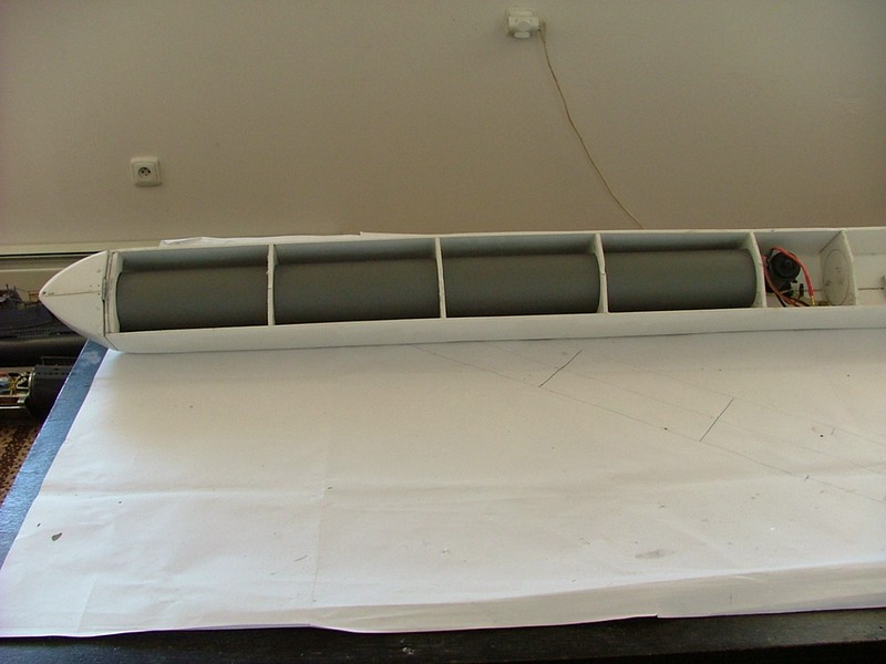 Je potrebné aby hrany spojov dna boli zabrúsené pod uhlom približne 45 stupňov čo zabezpečuje v ďalšom kroku vodotesnosť trupu. Tu by som odporučil aby pri lepení spodných dielov bola do rebier zasunutá odpaľovacia komora, ktorú tvorí trubka o priemere 75 mm. Tu som použil odtokovú trubku. Jej dĺžka je 80 mm. Táto zabezpečuje dostatočnú dĺžku k bezpečnému odpalu rakety V-2. Pokiaľ je súosovosť už vytvoreného trupu v poriadku.