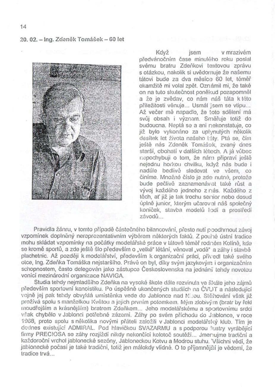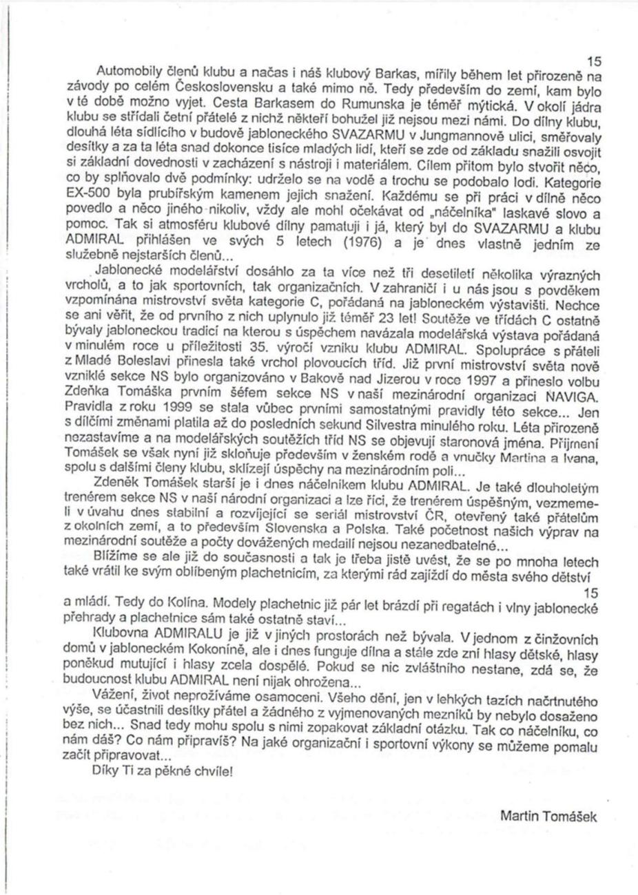 Až večer mě napadlo, že toto sdělení má svůj obsah i význam. Směřuje totiž do budoucna. Neptá se a ani nekonstatuje, co již bylo vykonáno za uplynulých několik desítek let života našeho táty. Ptá se, čím ještě nás Zdeněk Tomášek, zvaný dnes starší, obohatí v dalších létech. A já vůbec nepochybuji o tom, že nám připraví ještě nejednu horkou chvilku, když nás bude i nadále bedlivě sledovat ve všem, co činíme. Množné číslo je zde nutné, protože bude pečlivé zaznamenávat také růst a vývoj každého jednoho z nás. Každého z těch, ať již je tak trochu senior nebo dosud úplně junior, kterým učarova1 náš společný koníček, stavba modelů lodí a prostředí závodů…