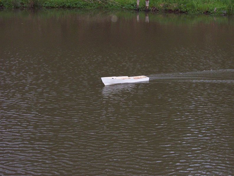 První plavba proběhla na rybníku vedle chaty. Bez vln a nečistot, na klidné hladině. Jízdní vlastnosti mě velmi příjemně překvapily. Model vodu doslova řeže s elegantně zvedlou přídí. Na svou délku a šířku (poměrně dlouhý a úzký tvar) dosahuje i hodně dobré obratnosti. Co mě ale nejvíce dostalo je rychlost, motory z lodi udělají pěkně svižnou střelu.