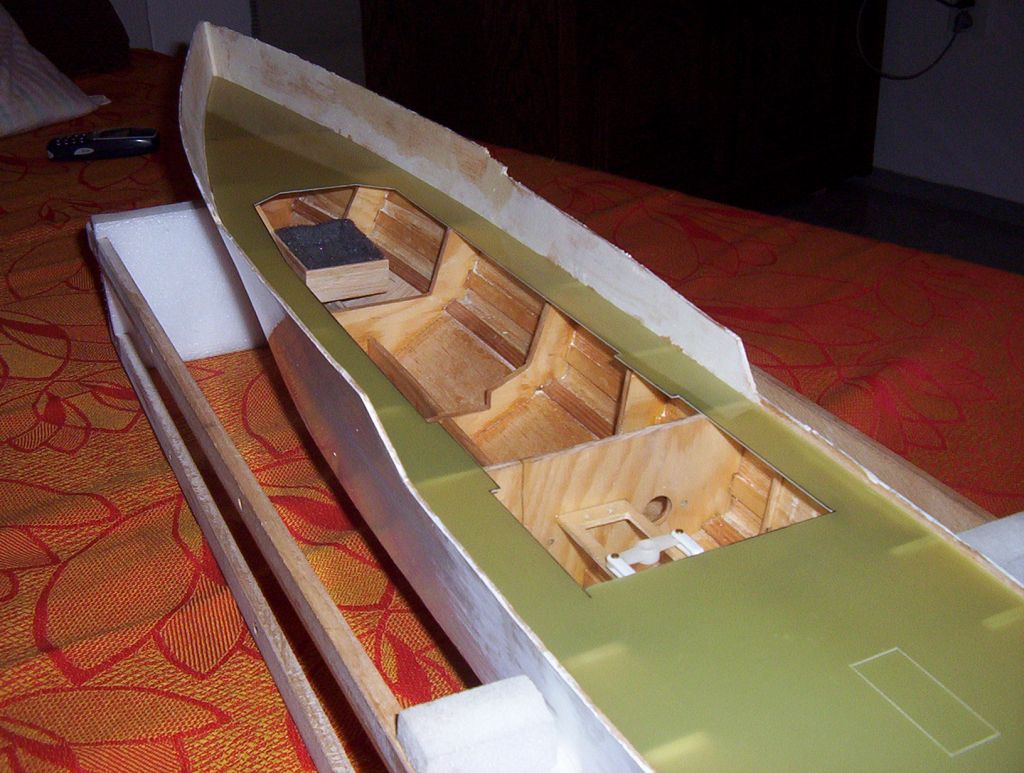 Po zaschnutí přetmelit a přebrousit spáry, slícovat je do roviny a mohl jsem vyrobit límec. Ten je opět z laminátu, z pásků asi 1cm širokých. Postupně jsem je vlepoval z vnitřní stravy otvoru a celý jej tak obešel dokola. Pro zvetšení lepené plochy ( při nasazování kabiny bude límec přece jenom namáhán ) jsou spoje podlepeny smrkovou lištou a úhly zality epoxidem. Nyní jsem považoval celou palubu za hotovou a vrhnul jsem se na bort. Před vlastním utvářením bortu bylo nutné udělat jeho vzpěry. Ze všeho nejdříve jsem si podle plánu překreslil na palubu jejich rozmístění a na tyto místa vlepil podstavce vzpěr, malé laminátové obdélníčky.