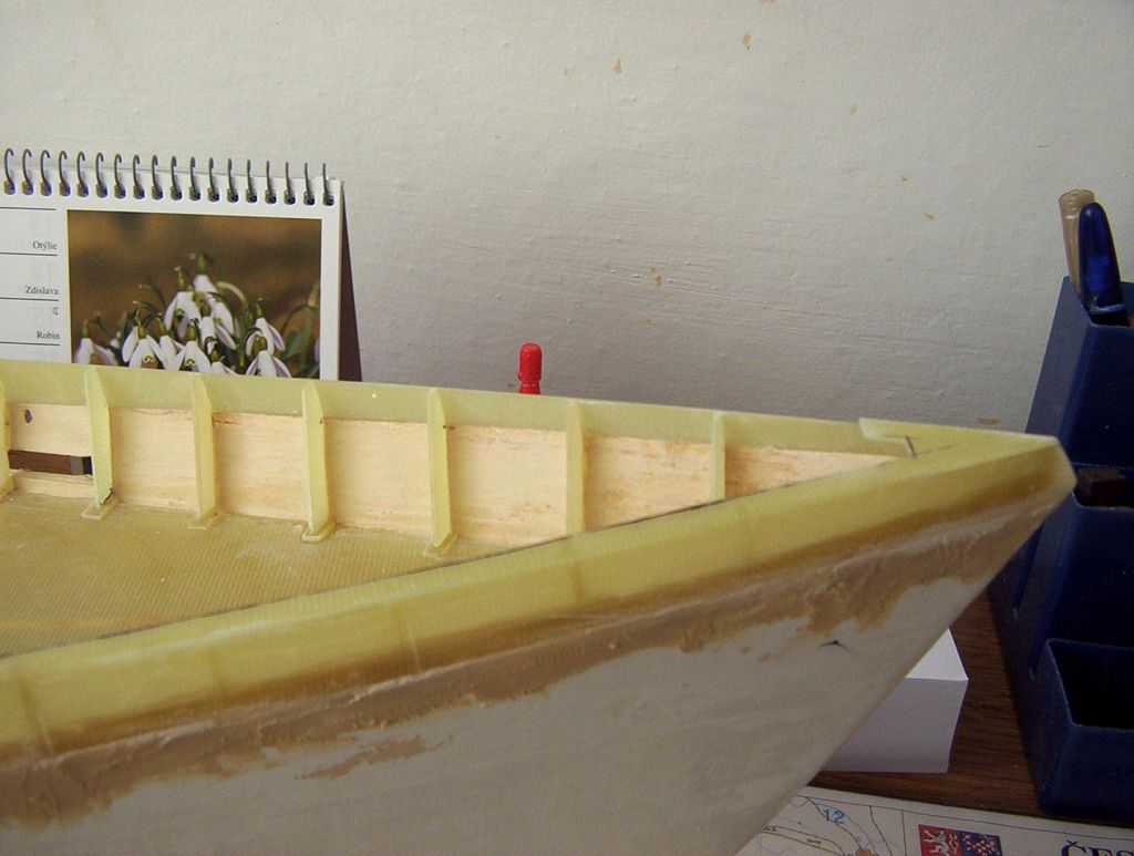 Ještě před samotným vlepením bylo ale nutno udělat něco, na co bych palubu přilepil. Samotné žebra se ukázaly jako nedostačující a paluba se prohýbala. Proto jsem na zádi a na přídi, kde už nezasahoval středový otvor, udělal jakýsi rošt ze smrkovích hranolků, který palubu podpírá.