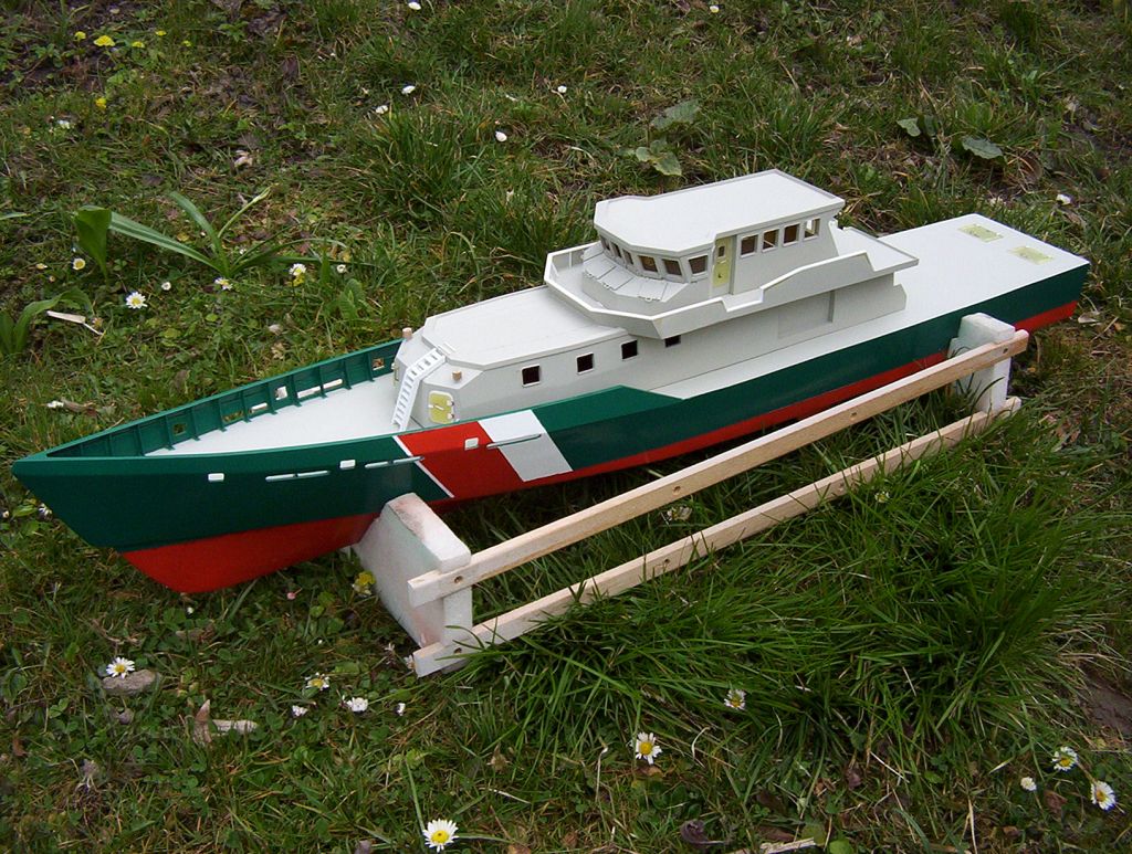 Opět jsem trup lehce přebrousil P800 a dal druhou vrstvu. Posléze přišla na řadu zelená, přesně „zelená friska“. Trup jsem zamaskoval maskovací páskou a dal mu zelený kabátek. Opět dvě, tři vrstvy, jak kde. Teď zamaskovat a stříknout pruhy na boku, nejprve bílou a pak do barvy. Nyní už zbývá jen dno na červeno, odstín „červená paprika“. Vše bez výraznějších komplikací s mi sympatickým výsledkem. Jen jsem musel občas některá místa poopravit a stříknout vícekrát. Nakonec až bylo hotovo, jsem palubu přebrousil P1000 pod vodou a pěkně jí vyhladil.