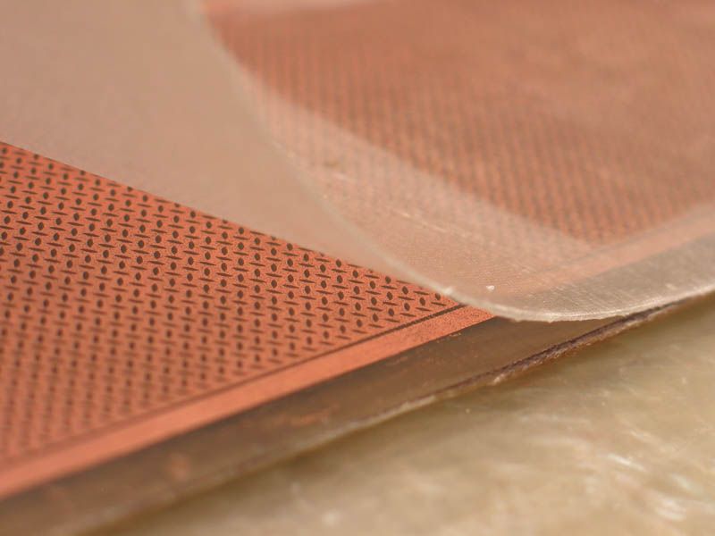Folii položíme na desku s fotocitlivou vrstvou. Pozor! folii musíte položit tištěnou stranou dolů. Přiklopíme čirou vyčištěnou skleněnou deskou. Pokud máme možnost odsát vzduch,