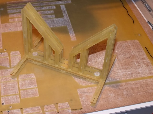 K lepení jsem použil vteřinové lepidlo, které jsem postupně nanášel do rohů konstrukce. Celá konstrukce je vyfrézována ze sklolaminátové desky tloušťky 1 mm a díly byly doplněny zámky jednodušší ustavení a pro následné lepení. Na krajích konstrukce budou doplněna montážní oka z drátu o průměru 1 mm.