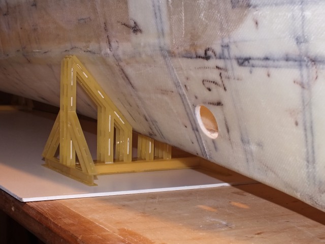 Vnitřní vyztužení je provedeno dřevěným hranolem 8x4 mm. Ten také bude sloužit k přechodu mezi konstrukcí stojánku a trupem. Ještě uvidím, jestli tam vlepím gumu nebo filc.