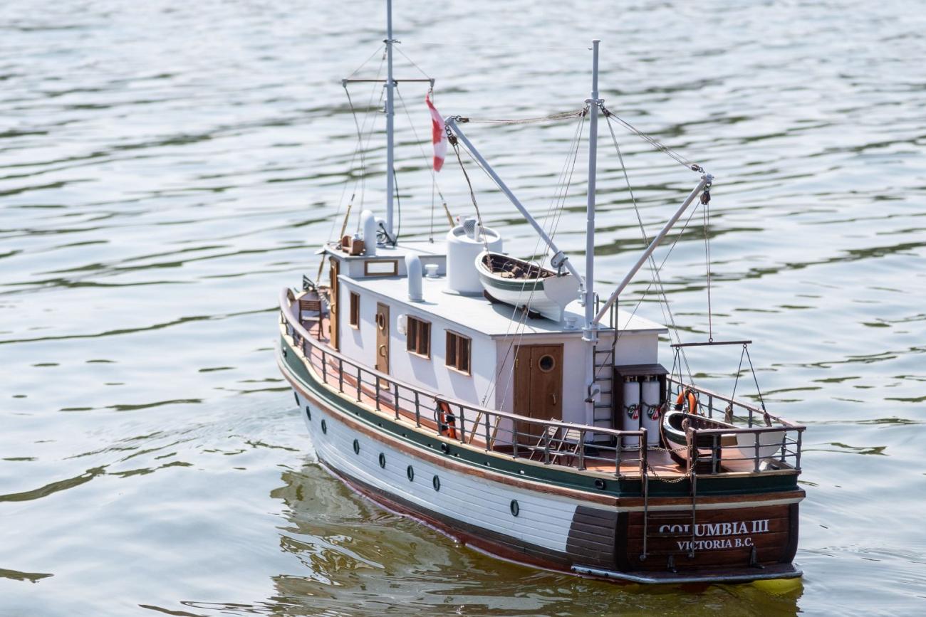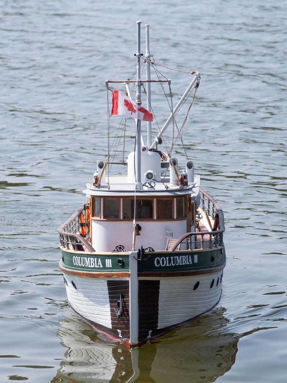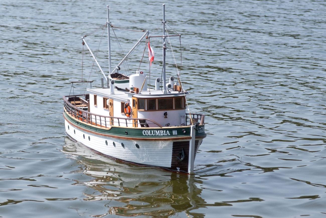 Moje Columbia III je v měřítku 1:20, motor 650, olověná baterie 12 V/5 Ah, výtlak cca 6 kg, délka přes všechno 1025 mm. Postaveno podle původních plánů z roku 1955. Doba stavby dva roky. Je plně vybavena včetně nábytku v kajutách. Konstrukce - směs dřevo, balsa a 3D tisk. Foto je z panenské plavby 20. 8. 2024.