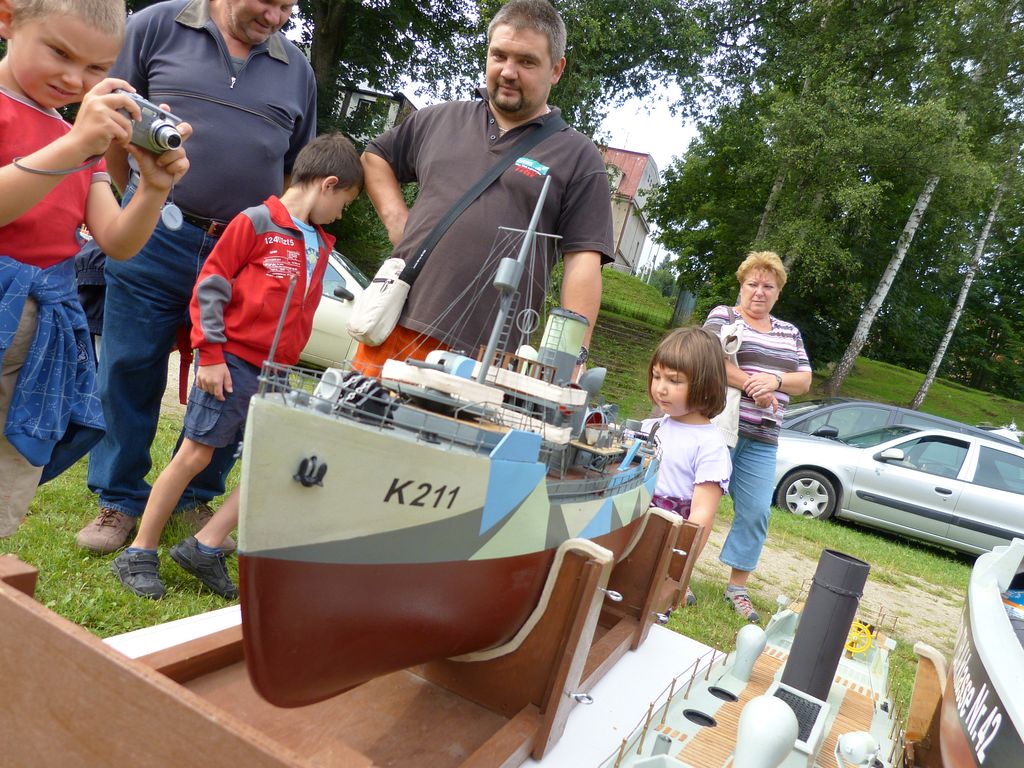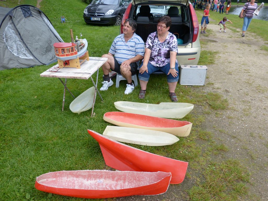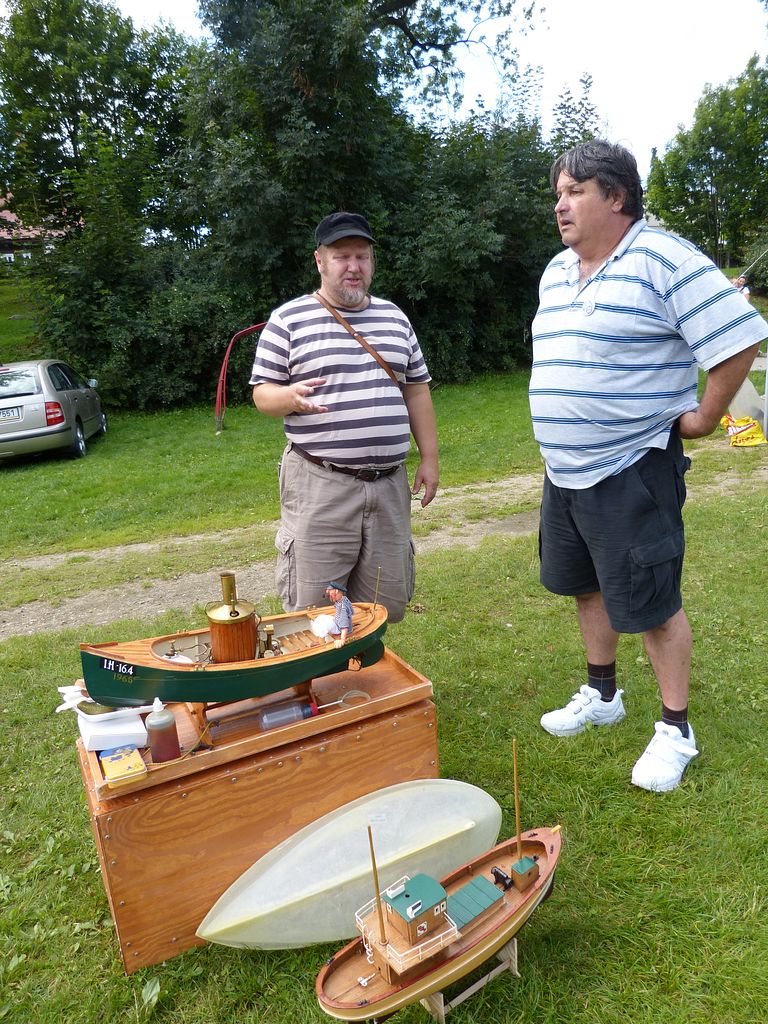 Stíhač ponorek se mi v uspokojivé kvalitě vyfotit nepodařilo, tak se alespoň podívejme na jeho stavitele Karla Majera. Napravo vidíme Ivana Hořejšího, který v rámci soutěžní jízdy ještě hlídá synka, a parník Radotín v plné jízdě.