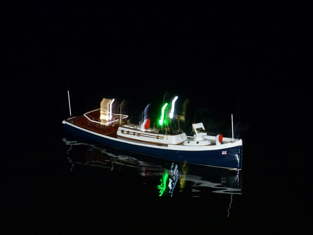 Noční soutěž začala v devět večer, kdy již byla regulérní tma. Do klání se zapojilo 16 modelů, přičemž někteří dvanáctkou projeli takovým fofrem, až nebylo možné se mezi očitými svědky dopátrat, kudy model vlastně projel, protože kromě pár světýlek nebylo nic vidět. Někteří kapitáni na to šli prozíravě s modelem, který sotva svítil. Příkladem za všechny budiž Tomáš Kočí, který svůj parník Renown vodil tratí skoro potmě. S úžasem jsme vždy čekali, kde se ze tmy vynoří. Další parník Renown, se kterým se zapojil Vladimír Šrámek, svítil až moc. Přestože oba skončili na posledních místech, šlo o milé zpestření soutěže.