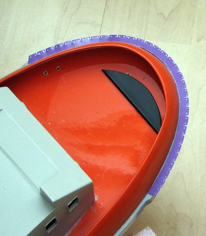 Nyní bylo potřeba udělat velký průvlak na zádi a výztuhu na přídi. K tomu jsem použil černou plastovou destičku