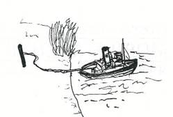 na plnou délku lanka. Spojnici kolík - remorkér udržujte kolmo ke břehu. 3 Jeďte s remorkérem na plný
